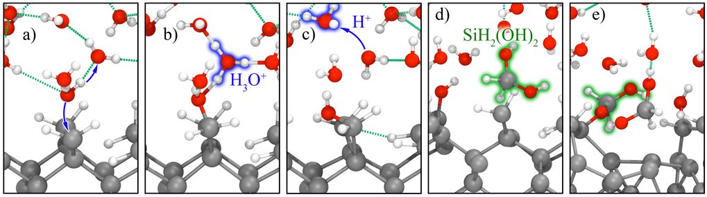 MD simulations of this type allow us to identify detailed reaction mechanisms and intermediates. The applied electric bias is then adjusted to stabilize intermediates of interest, so that vibrational spectra can be calculated from MD simulations and the maximum entropy method. By comparing to optical fingerprints from attenuated total internal reflection (ATR-IR) spectroscopy, we validate our methods and interpret experiments. This work is performed in close collaboration with the Interface Spectroscopy Group.
