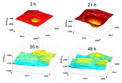 In der Untersuchung der korrosionsgetriebenen Delamination organischer Beschichtungen nimmt das MPIE eine weltweit führende Rolle ein: Hierfür entwickelte Martin Stratmann die sog. Raster-Kelvin-Sondentechnik (SKP). Am Beispiel der technisch hoch relevanten Zink-Magnesium-Aluminium-Schichten konnte am MPIE gezeigt werden, dass die elektronischen Eigenschaften der Oxide, die sich an der Oberfläche dieser Schichten bilden, eine zentrale Rolle für die Beständigkeit gegen sog. kathodische Delamination direkt auf ihnen applizierter organischer Beschichtungen spielen. Dies führt z.B. dazu, dass bei ausreichend hohem Mg-Anteil diese schnelle und daher besonders gefährliche Unterwanderungsart ohne weitere Vorbehandlung der Schicht ganz gestoppt werden kann (Bild und [1]).