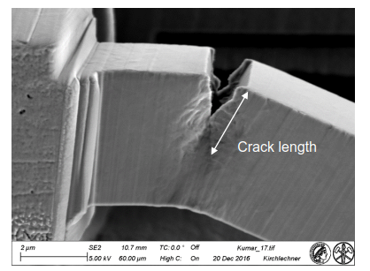 Within this project we are assessing various different geometries of the sample and the pre-notch, methods for measuring the crack extension and looking into the impact of the testing machine. All experiments are conducted using nanoindenter systems placed inside a scanning electron microscope. Materials in our focus are – macroscopically – brittle. They comprise nano-crystalline W, Cr and Zr thin films as model matrials. The established protocols are further used to investigate daily life alloys like white etching layers (WELs) in rail steel.