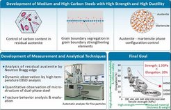 The framework of ISMA is shown in Figure 1. 39 major Japanese structural materials manufacturers including three major steel companies, more than 50 universities and Japanese national institutes join this project. Figure 2 summarizes the developments of medium and high carbon steels (more than 0.3% of carbon contents) with high strength and high ductility, and the steels with the tensile strength of 1.5GPa and the elongation of 20% have been developed. Two new steel research projects regarding hydrogen embrittlement and corrosion of high tensile strength steels were started in 2017.