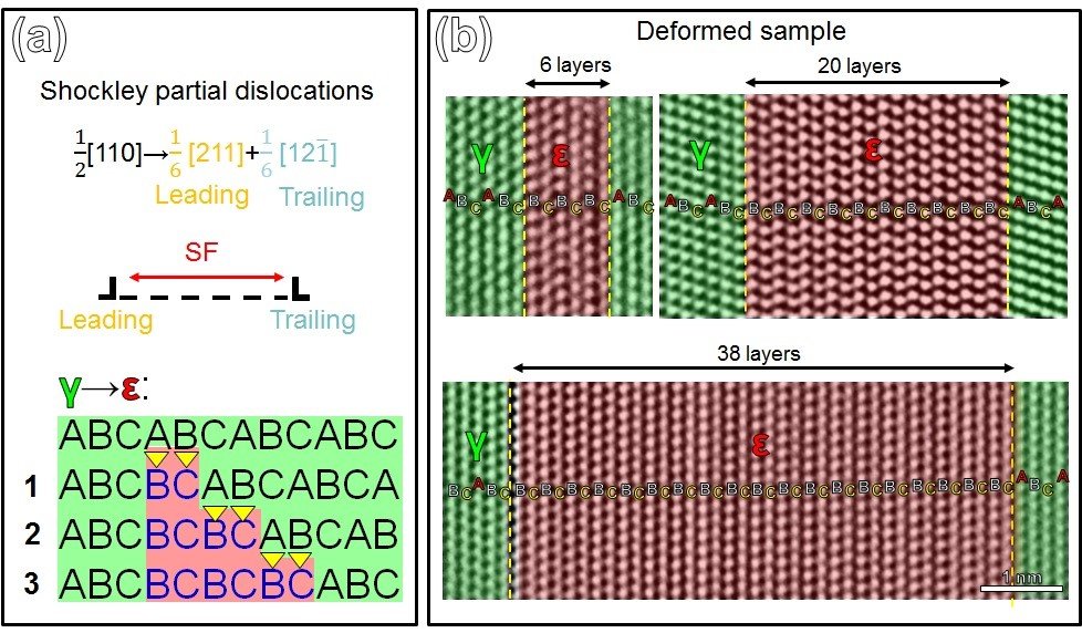 The displacive phase transformation from face-centered cubic (FCC) γ phase to hexagonal close-packed (HCP) ε martensite and the reverse transformation (ε→γ) play a key role in enhancing the mechanical properties of FCC alloys, especially for the recently developed TRIP-assisted dual-phase HEAs. These phase transformations strongly depend on the stacking fault energy, instant temperature and stress condition during mechanical loading.