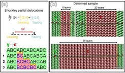 Figure 1 The mechanism of strain-induced martensitic transformation in the dual-phase high-entropy alloys upon strain loading. (a) Strain results in a separation of two Shockley partial dislocations (leading and trailing) from a perfect dislocation and then creates a stacking fault. (b) Typical high resolution HAADF-STEM images of the strain-induced ε laminates with different numbers of atomic layers in the FCC γ block after deformation.