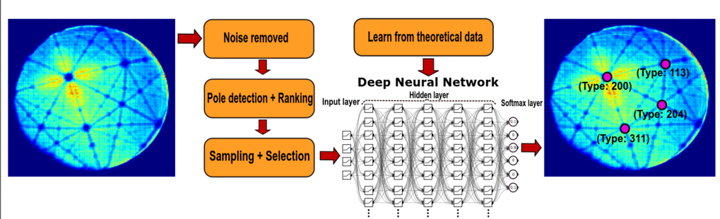 Researchers at the MPIE now make use of tools from the big data community. An example is the analysis of the field desorption patterns obtained from atom probe tomography (APT). APT maps the 3D position and chemical identity of up to a billion atoms in a material. The pattern formed on the single-particle detector often reveal traces of the crystallographic structure and orientation of the specimen. However, it remains largely under-utilised due to the lack of efficient and accurate extraction techniques. We have proposed a mixture of feature detection, machine learning and deep learning to enable automatic identification of crystallographic patterns observed on atom probe detector maps. Preliminary results exploiting theoretical geometric relationships have been very promising. A flow-chart outlining this process is shown in the Figure below. For detector hit-maps obtained from pure-Al specimens, our approach correctly characterised the orientation of single crystals with 98% confidence. Further forays into deploying big-data methodologies to advance APT data processing is a current focus of this project.