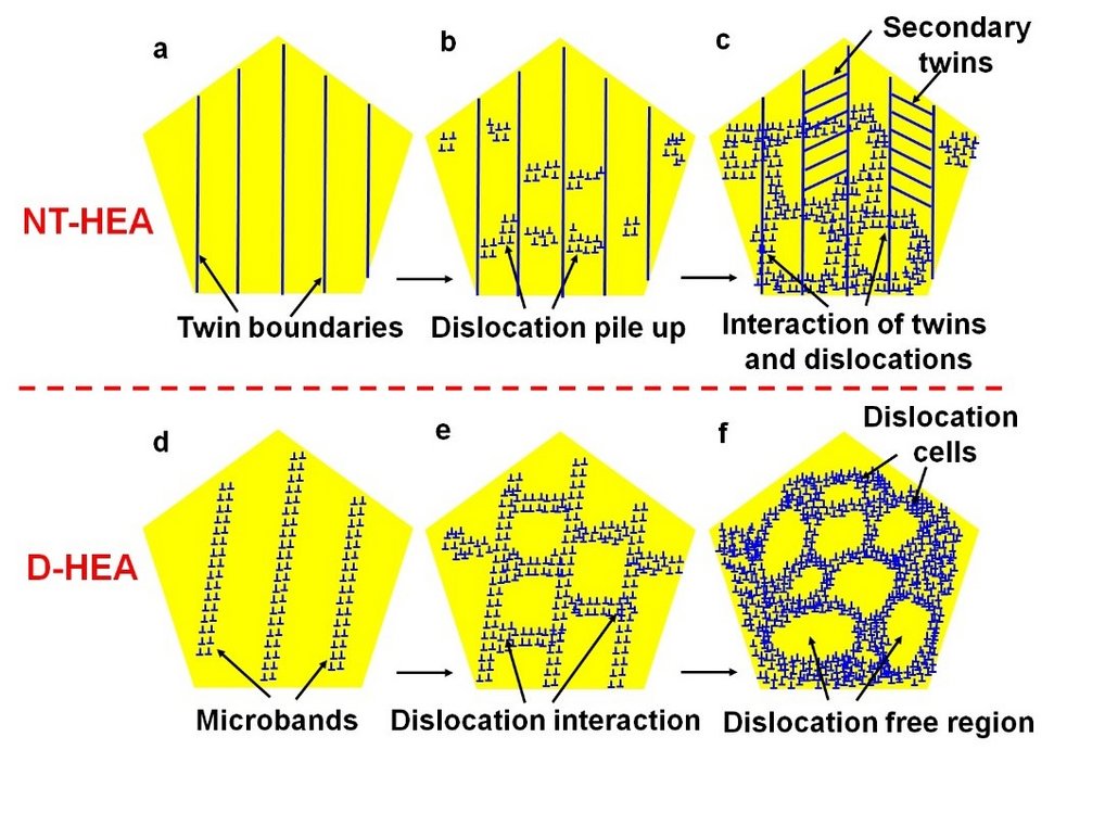 Schematic showing the evolution of microstructures of the two high entropy alloys