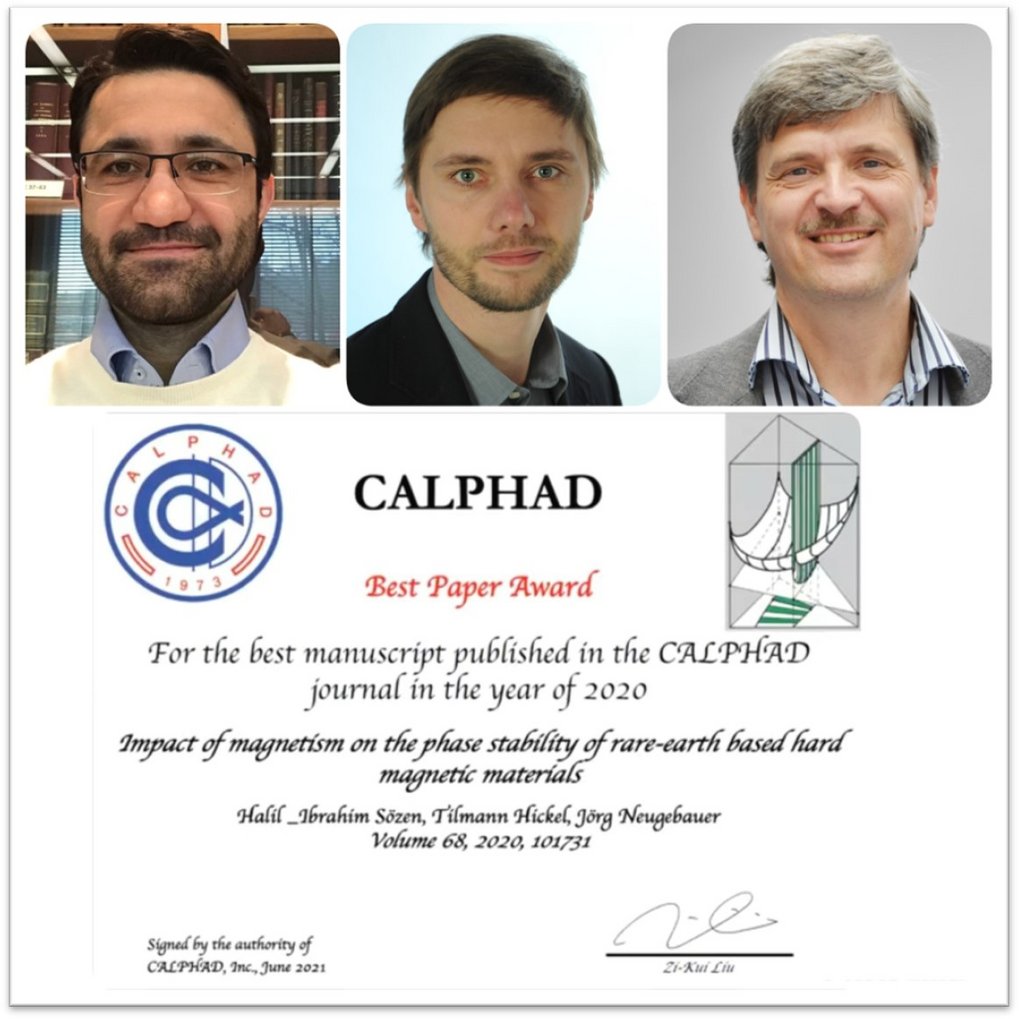 Dr. Halil Ibrahim Sözen, Dr. Tilmann Hickel and Prof. Jörg Neugebauer from the department Computational Materials Design at the MPIE, won a Best Paper Award for their article titled “Impact of magnetism on the phase stability of rare-earth based hard magnetic materials”. It was published in a special issue of the CALPHAD Journal on the occasion of Prof. Gerhard Inden’s 80th anniversary and was now selected by the CALPHAD Advisory and Editorial Board members for the best manuscript published in this journal in the year 2020. The prize is endowed with 1000 US-Dollars.