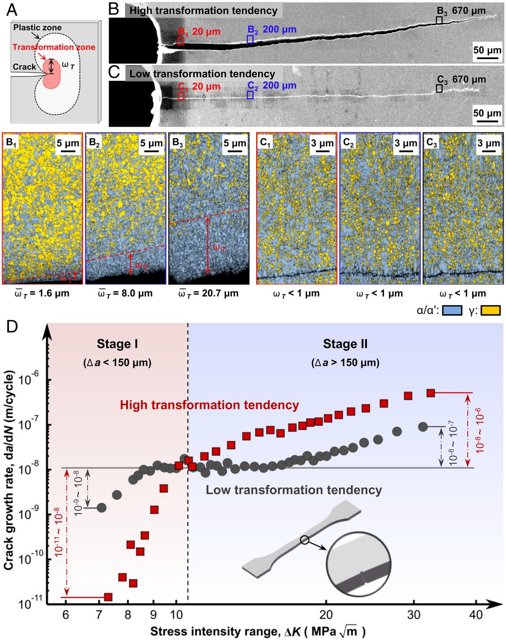 About 90% of all mechanical service failures are caused by fatigue. Avoiding fatigue failure requires addressing the wide knowledge gap regarding the micromechanical processes governing damage under cyclic loading, which may be fundamentally different from that under static loading. This is particularly true for deformation-induced martensitic transformation (DIMT), one of the most common strengthening mechanisms for alloys. Here, we identify two antagonistic mechanisms mediated by martensitic transformation during the fatigue process through in situ observations and demonstrate the dual role of DIMT in fatigue crack growth and its strong crack-size dependence. Our findings open up avenues for designing fatigue-resistant alloys through optimal use of DIMT. They also enable the development of physically based lifetime prediction models with higher fidelity.