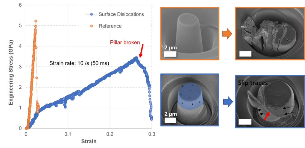Most oxide ceramics are known to be brittle macroscopically at room temperature with little or no dislocation-mediated plasticity prior to crack propagation. The importance of studying deformation on oxide ceramics lies in its increasing importance for dislocation-tuned functionality such as superconductivity and electrical conductivity for next-generation functional devices. Understanding how dislocations behave in these materials is critical for the mechanical reliability of the materials and devices designed for utilizing these dislocation-tuned functionalities. Some ceramics as perovskite SrTiO3 and KNbO3 show dislocation mediated plastic deformation on the macroscale even at room temperature. However, the mechanical properties of these materials in the micro-/nanoscale at extreme (low/high) strain rates have not been studied yet. In this project, we aim to investigate the dynamic mechanical response of single-crystal SrTiO3, a model perovskite that has been used to fabricate functional devices, at a wide range of strain rates, i.e. from quasi-static (0.001/s) up to high strain rates (1000/s). The irreversible deformation of functional oxides at such high strain rates is critical to understand for the optimal selection of such materials, structural design and mechanical reliability at for instance high frequencies.