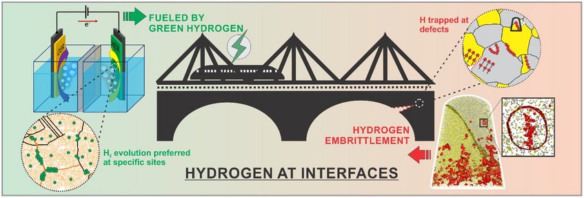 The group studies the science of hydrogen at and across microstructural defects, both in structural and energy-related materials, in close reflection of the associated complex redox phenomena taking place in and at the surfaces of these materials. Many of these phenomena are of highest relevance for developing novel materials and processes that leverage a hydrogen-driven carbon-neutral economy, such as catalysis and sustainable material production.