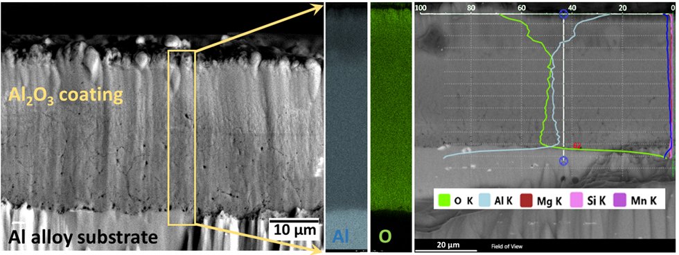 Al2O3 nearly in equal fraction and at lower coating thicknesses, making them more attractive and economically superior to conventional plasma electrolytic oxidation coatings. Structural and mechanical characterization of the coatings is carried out to investigate the fracture and adhesion properties of the coatings using state of the art facilities. An additional novelty of the project involves sealing the defects in the deposited Al2O3 coating by polymeric sealants to further enhance the hydrogen barring effect. The overall goal is to achieve conformal coatings with high hydrogen permeation reduction factor coupled with attractive mechanical properties such as high fracture toughness and tribological properties.